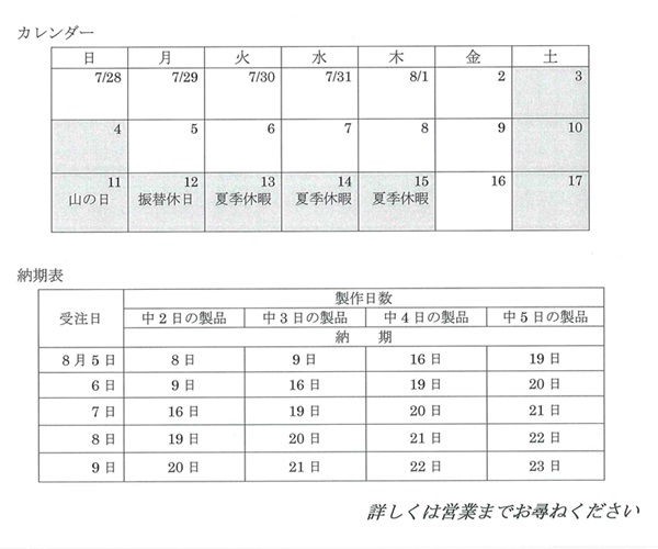 弊社では8月10日(土)~15日(木)を夏期休暇のため、休業させて頂きますのでお知らせいたします。