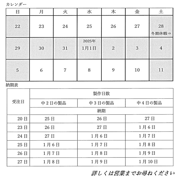 弊社では、12月28日(土)~ 1月5日(日)を冬期休暇のため、休業させていただきますのでお知らせ致します。